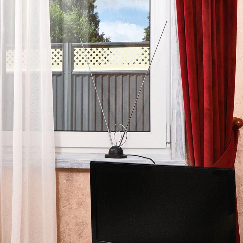 Антенна оснащена регулируемыми телескопическими усами (диполи), которые позволяют настраивать качество приема телевизионного сигнала.