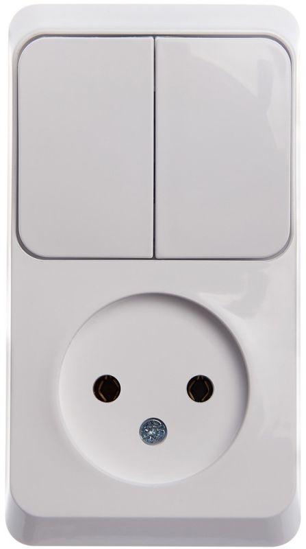 Блок Systeme Electric (ранее Schneider Electric) ЭТЮД (белый, открытой установки) предназначен для применения в сетях до 250В, состоит из розетки без заземления, без шторок на 16А и двухклавишного выключателя на 10А. Две клавиши позволяют управлять двумя источниками света с одной точки. Он удобен в применении и отлично подходит для коридора. Сделано в России.