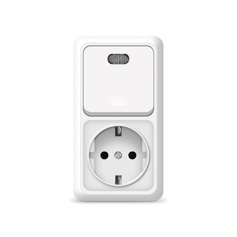 Блок объединяет одноклавишный выключатель и розетку.