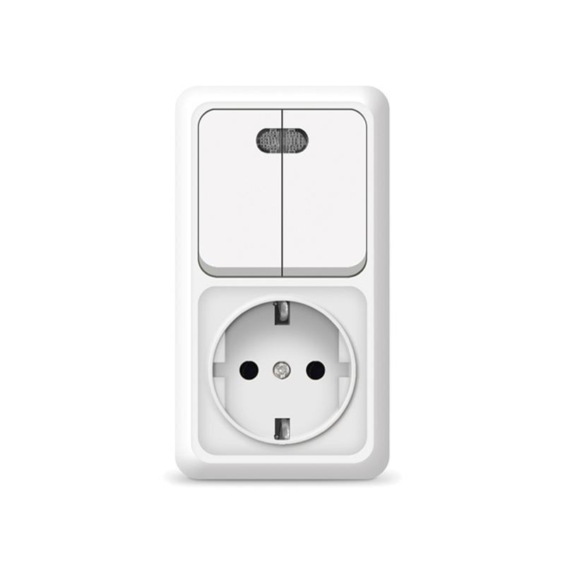 Блок объединяет двухклавишный выключатель и розетку.