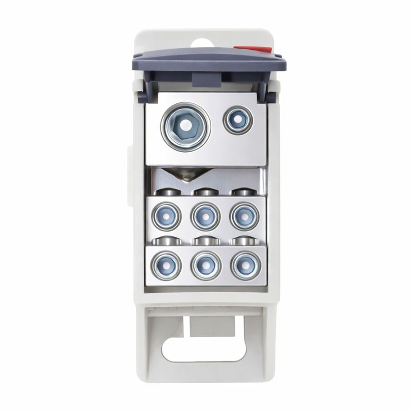 Распределительный блок POD-125 с винтовым зажимом служит для соединения и распределения многожильных или обжатых наконечником гибких проводников в электрических щитах. Установка на DIN-рейку высотой 35 мм или монтажную плату. Боковой штифт обеспечивает стыковку блоков между собой. На крышке распределительного блока нанесена ключевая информация, а также есть паз для маркировки NUTB5. В комплект входит цветная пластиковая маркировка (синий, зеленый, красный, желтый) и самоклеящаяся (L1, L2, L3, N, заземление, круг). Корпус выполнен из полиамида с классом горючести V0 UL-94. Степень защиты – IP20. Цвет – серый, 1 ввод с сечением 10-35 мм2, 7 точек подключения (выводов) с номинальным сечением проводников 2,5-16 мм2. Габариты (В?Ш?Г) – 48,5?31,1?76,5 мм.