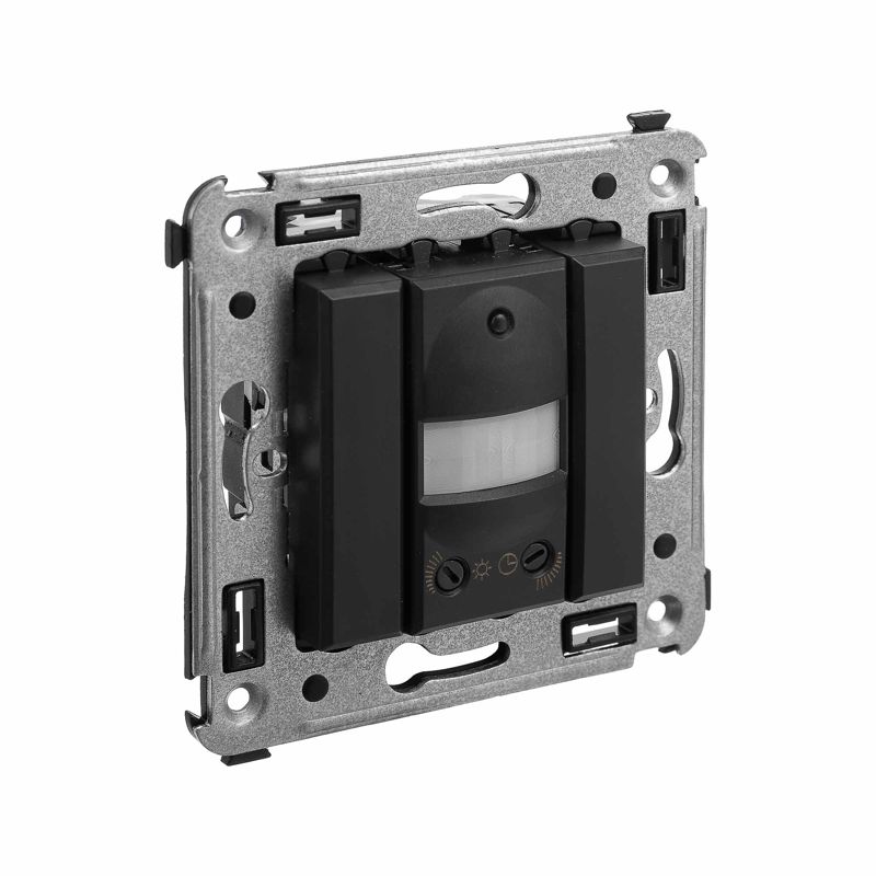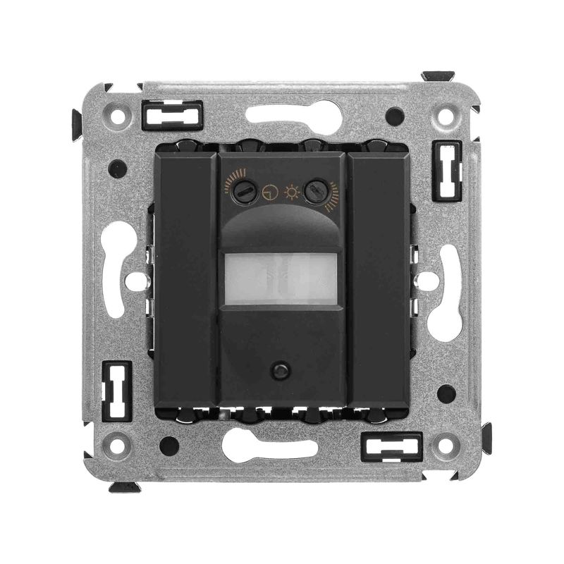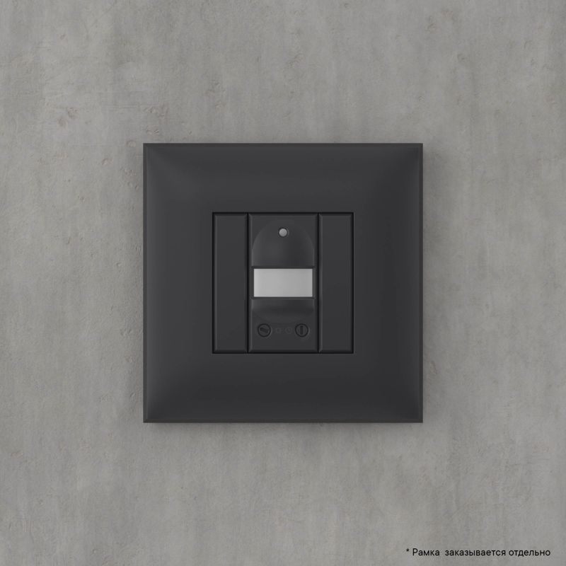 Датчик движения. Назначение: для монтажа в подрозеточные коробки глубиной не менее 45 мм (код 59301). Используется для автоматического включения/выключения света. Характеристики: диаметр отверстий для ввода кабелей – 3 мм; винтовые зажимы; шаблон для зачистки кабеля – 11 мм; расстояние обнаружения – от 2 до 12 м; угол охвата – 150°; время задержки отключения – от 10 с до 7 мин.; настройка светочувствительности датчика; настройка порога освещенности. Фиксация производится в подрозеточные коробки глубиной не менее 45 мм при помощи каркаса с лапками (код 4400802) и саморезов. Цвет: "Черный матовый".