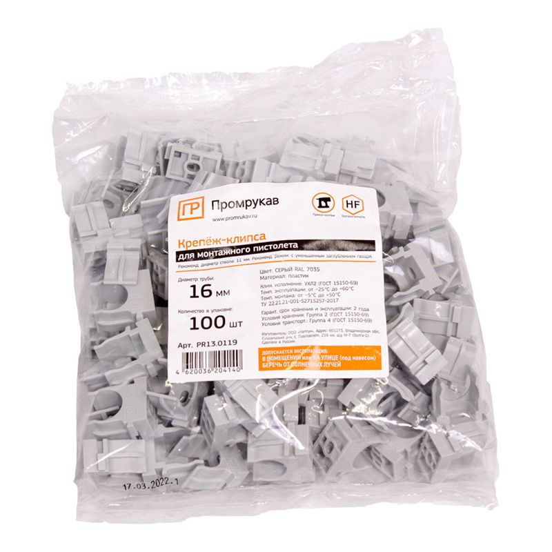 Держатель для труб (клипса) d16мм для монтажного пистолета в п/э сер. Промрукав PR13.0119
