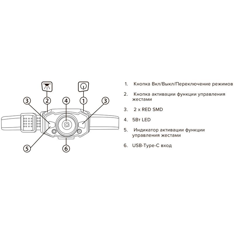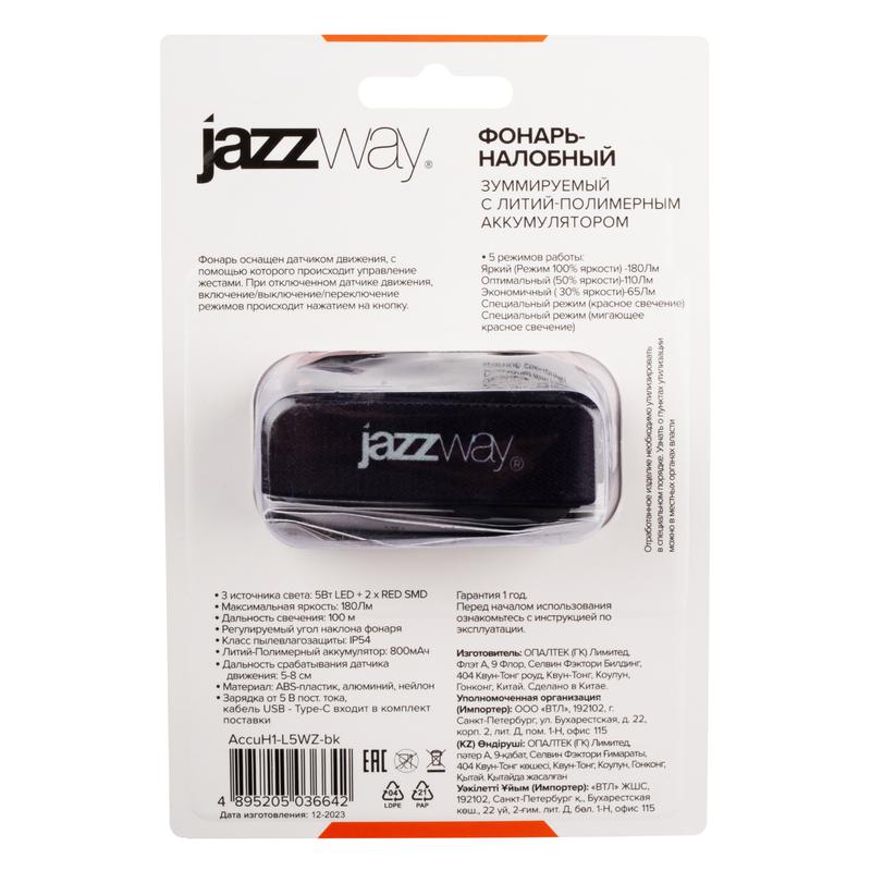 Фонарь аккумуляторный налобный AccuH1-L5WZ-bk zoom LED 5Вт + 2хRED SMD IP54 5 режимов: 100проц. 180лм 3.5ч/50проц. 110лм 5.5ч/30проц. 65лм 15ч/красн. 28ч/мигающ. красн. 12ч аккум. 0.8А.ч управл. жестами черн./сер. JazzWay 5036642