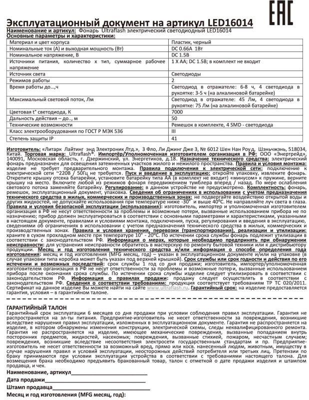 Фонарь Ultraflash электрический светодиодный со встроенным в рукоятку кемпинговым плафоном. Цвет корпуса: чёрный. Работает от 1 X AA батарейки (не входит в комплект). Материал корпуса - пластик. Источник света - 1 светодиод в отражателе и 4 SMD светодиода в плафоне; цветовая температура 7000К, световой поток 45 / 75 люмен. Дистанция освещения до 50 метров. 2 режима работы. Выключатель - полозкового типа. Время работы при использовании алкалиновой батарейки: до 8 часов. Степень пыле-влаго-защиты IP41. Упаковка - полиэтиленовый пакет с хедером. Максимальный линейный размер фонаря 10,5 см. Размер упаковки 4,5 см x 10 см x 17 см. Вес без упаковки 0,042 кг. Вес с упаковкой 0,048 кг.
