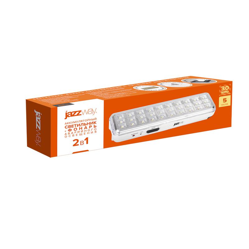 Фонарь-светильник аккумуляторный Accu9-L30-wh аварийный 30SMD яркий 300лм 2ч/эконом 90лм 6ч 220В аккум. Li-ion 3.7В 1.2А.ч бел. JazzWay 5024533