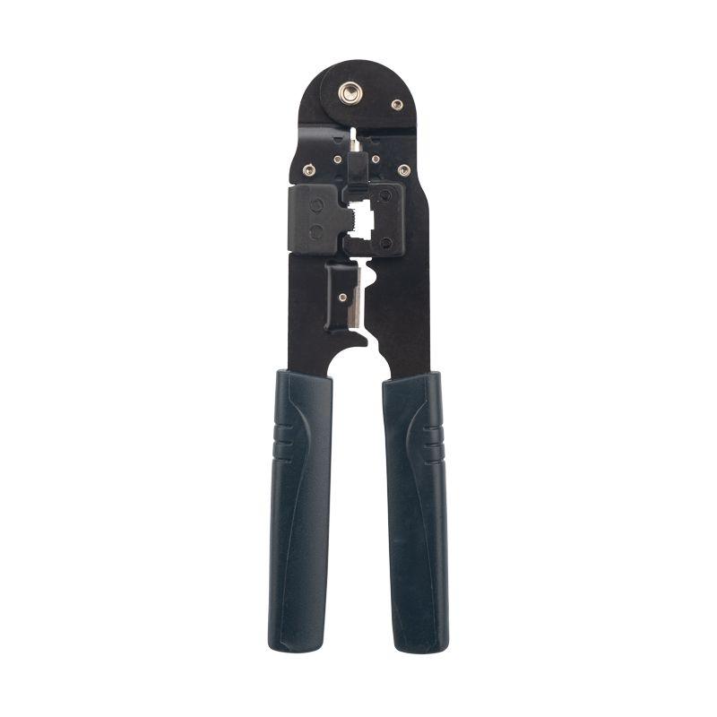 Корпус кримпера изготовлен из высокопрочной хром-ванадиевой стали с воронением, благодаря чему устойчив к механическим воздействиям и имеет продолжительный срок службы. Возможна замена обжимных матриц, что дает возможность использовать один инструмент для обжима различных разъемов. Инструмент обладает дополнительными функциями обрезки проводов и снятия изоляции с плоских и круглых кабелей. Оснащен возвратным механизмом, который обеспечивает обратный ход рукояток и упрощает процесс работы с инструментом. Однокомпонентные защитные рукоятки выполнены из плотного нескользящего синтетического материала, который делает работу с инструментом легкой и приятной.