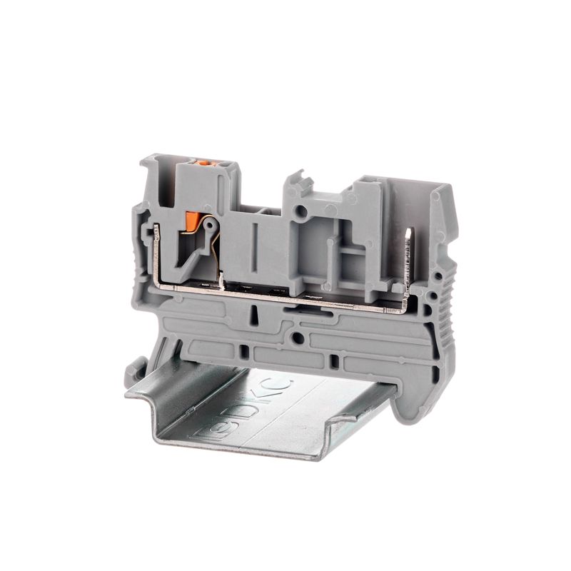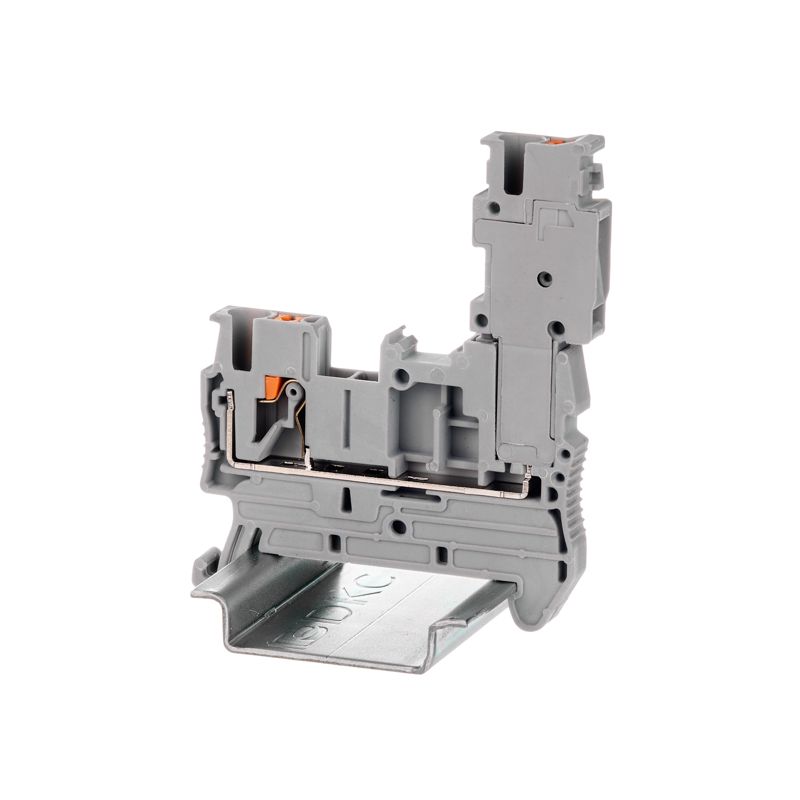 Клемма проходная с Push-in зажимом под вставной разъем предназначена для коммутации проводников двух через разъемный штекер, который вставляется в клемму. Монтаж на DIN-рейку OMEGA. Температура эксплуатации от -40 до +105°C. Корпус выполнен из ПА 6.6 с классом горючести V0 UL-94.