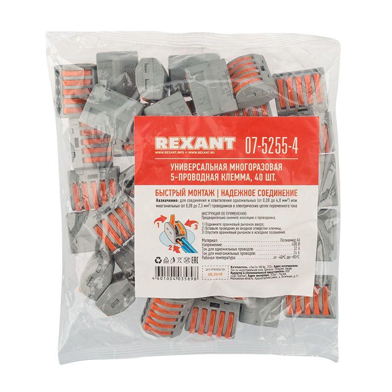 Клемма универсальная многоразовая 222-415 5-проводная 0.08-2.5(4)кв.мм (уп.40шт) Rexant 07-5255-4