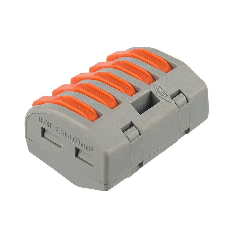 Соединительная многоразовая клемма REXANT на 5 проводников с плоско-пружинным зажимом предназначена для подсоединения медных одножильных и многожильных зачищенных проводников тонкого сечения.