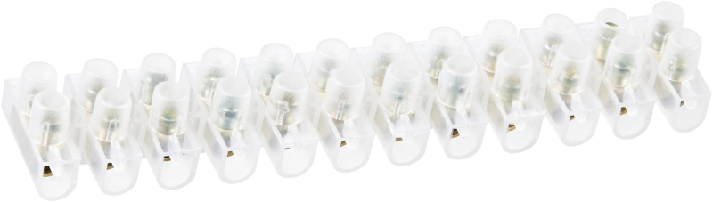 Клемная колодка состоит из 12 парных зажимов и легко режется на блоки с меньшим числом клеммных пар. Подключение электрических проводников осуществляется при помощи прижатия проводов винтами из оцинкованной стали. Материал корпуса колодки – белый или черный пластичный полиэтилен. Материал металлической планки – латунь.