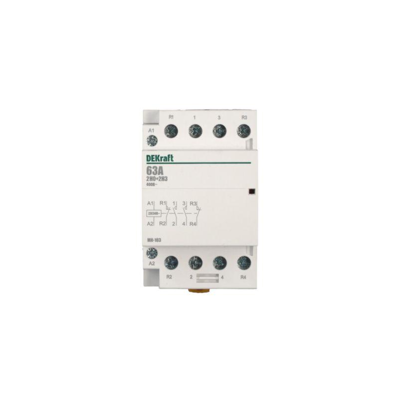 Модульный контактор серии МК-103 Dekraft; ном.ток 63 А (АС-7а); кол-во и исполнение контактов – 2НО+2НЗ; напряжение управления 220 В пер.тока; ширина – 3 мод. х 18 мм; установка – на DIN-рейку. Контакторы МК-103 применяются в сетях напряжением до 400 В пер.тока для дистанционного управления небольшими нагрузками, требующими большого количества включений / отключений, например, насосы, системы вентиляции и т.п. Модульные контакторы не требуют дополнительных настроек и специального обслуживания.