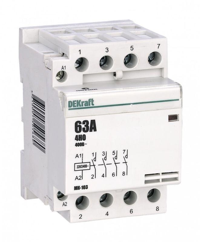 Модульный контактор серии МК-103 Dekraft; ном.ток 63 А (АС-7а); кол-во и исполнение контактов – 4НО; напряжение управления 220 В пер.тока; ширина – 3 мод. х 18 мм; установка – на DIN-рейку. Контакторы МК-103 применяются в сетях напряжением до 400 В пер.тока для дистанционного управления небольшими нагрузками, требующими большого количества включений / отключений, например, насосы, системы вентиляции и т.п. Модульные контакторы не требуют дополнительных настроек и специального обслуживания.