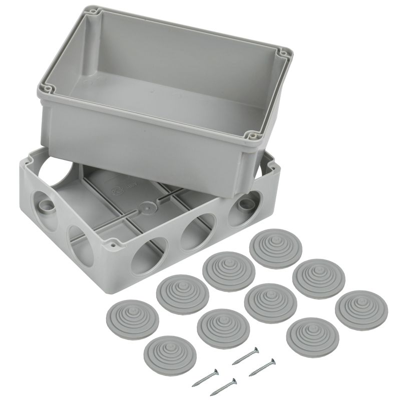 Монтажные коробки для открытого монтажа предназначены для разветвления проводов и кабелей, также для скрытия и дополнительной защиты мест коммутации. Используются как часть системы электрической канализации, состоящей из жестких и гофрированных труб. Коробки с повышенной степенью защиты могут быть использованы на открытом воздухе, а также во влажных и пыльных помещениях. Подходят для прямого монтажа. Материал изготовления: основание - полистирол, крышка - полипропилен. Материал коробок является безгалогенным («HF» — halogen-free). Цвет: серый. Степень защиты: IP44. Количество вводов: 10 - D=32мм. Размер: 190х140х120мм.