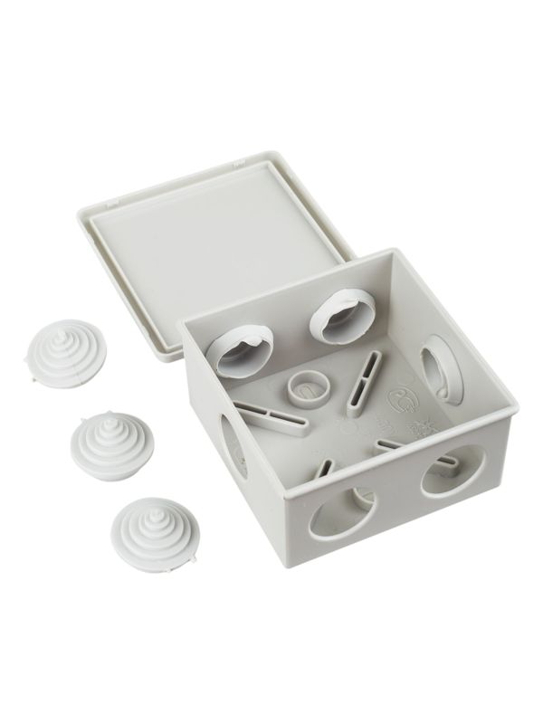 Монтажные коробки для открытого монтажа предназначены для разветвления проводов и кабелей, также для скрытия и дополнительной защиты мест коммутации. Используются как часть системы электрической канализации, состоящей из жестких и гофрированных труб. Коробки с повышенной степенью защиты могут быть использованы на открытом воздухе, а также во влажных и пыльных помещениях. Подходят для прямого монтажа. Материал изготовления: основание - полистирол, крышка - полипропилен. Материал коробок является безгалогенным («HF» — halogen-free). Цвет: серый. Степень защиты: IP44. Количество вводов: 6 - D=20мм. Размер: 85х85х40мм.