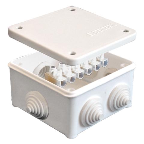 Коробка распр. ОП 85х85х45 7 выходов 3 гермоввода с клемм. 10А 6 контактов IP54 крышка на винтах бел. Epplast 130113