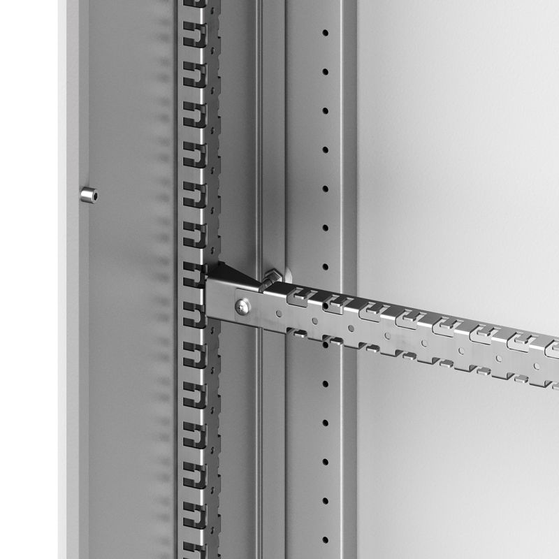 Кронштейны предназначены для монтажа реек по ширине корпуса. Изготовлены из оцинкованной стали толщиной 1,5 мм, что обеспечивает их прочность и долговечность. Монтаж производится на рейки, смонтированные на боковых стенках корпуса. В комплект поставки входят два кронштейна и необходимые монтажные аксессуары для удобного и надежного крепления.