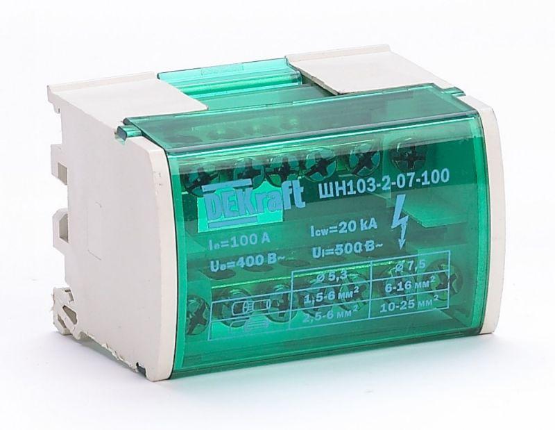 Кросс-модуль серии ШН-103 Dekraft; номинальный ток - 100 А; исполнение – 2 ряда по 7 отверстий (5х5,3 + 2x7,5); материал корпуса – нагревостойкий пластик; материал шин – высококачественная электротехническая бронза; каждая шина отдельно изолирована; цвет крышки – зеленый; установка – на DIN-рейку 35 мм или на монтажную панель двумя винтами M4; степень защиты - IP20. Применение кросс-модулей в щите обеспечивает компактную разводку кабелей и защиту от прикосновения к токоведущим частям.