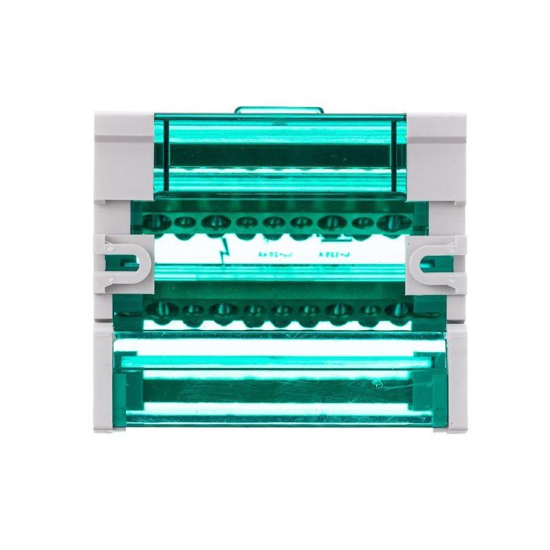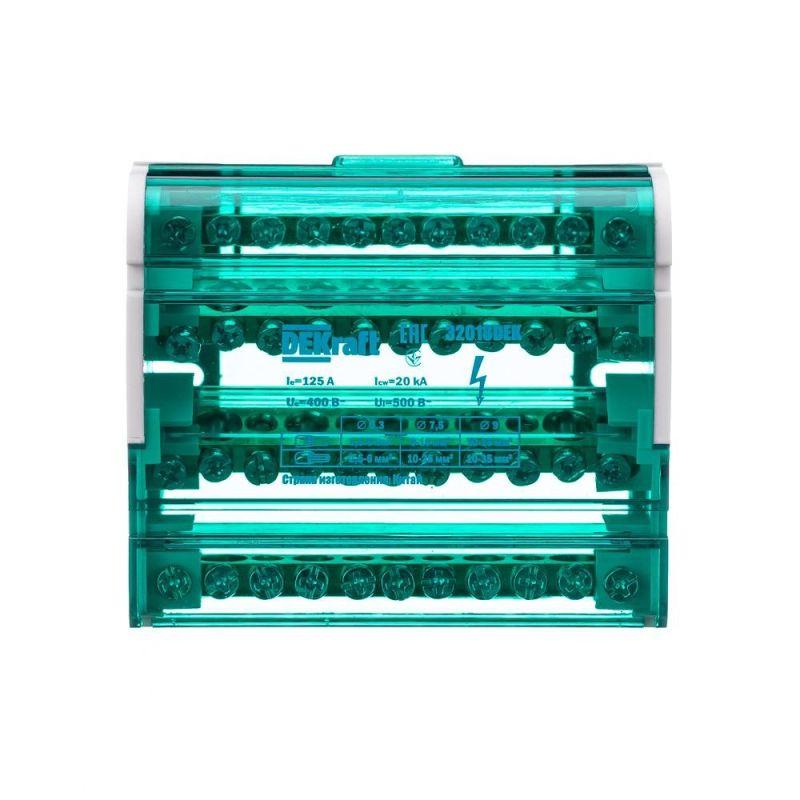 Кросс-модуль серии ШН-103 Dekraft; номинальный ток - 125 А; исполнение – 4 ряда по 11 отверстий (7х5,3 + 2x7,5 + 2x9,0); материал корпуса – нагревостойкий пластик; материал шин – высококачественная электротехническая бронза; каждая шина отдельно изолирована; цвет крышки – зеленый; установка – на DIN-рейку 35 мм или на монтажную панель двумя винтами M4; степень защиты - IP20. Применение кросс-модулей в щите обеспечивает компактную разводку кабелей и защиту от прикосновения к токоведущим частям.