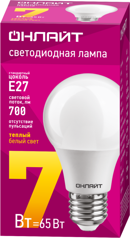 Лампа светодиодная 71 647 OLL-A60-7-230-2.7K-E27 7Вт грушевидная 2700К тепл. бел. E27 525лм 176-264В ОНЛАЙТ 71647