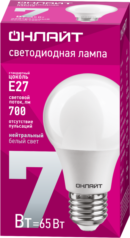 Лампа светодиодная 71 648 OLL-A60-7-230-4K-E27 7Вт грушевидная 4000К нейтр. бел. E27 610лм 176-264В ОНЛАЙТ 71648