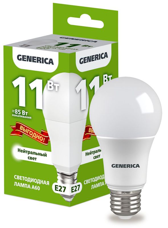 Лампа светодиодная A60 11Вт грушевидная 4000К E27 230В промо GENERICA LL-A60-11-230-40-E27-G