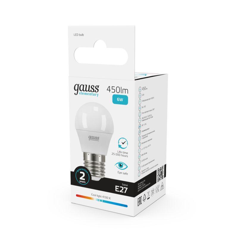 Лампа светодиодная LED Elementary Globe 6Вт E27 4100К Gauss 53226 – лампа с колбой вида "шар", белого света, длиной 87 мм, диаметром 45 мм, с цоколем Е27, мощностью 6 Вт. Цветовая температура 4100 К.