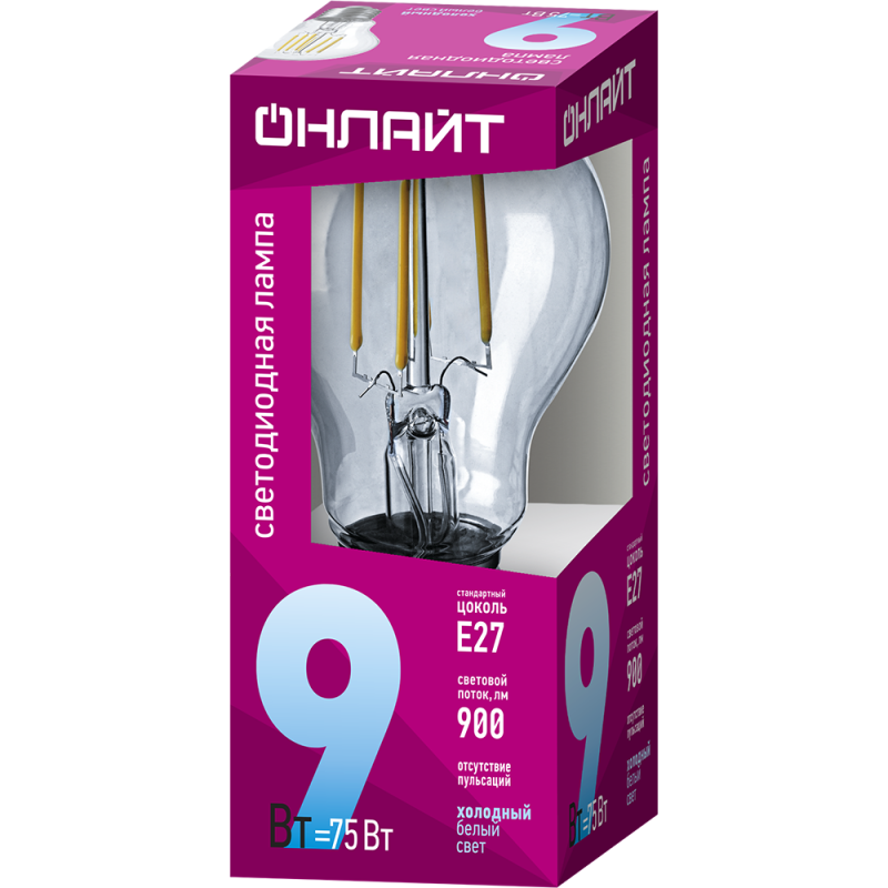 Лампа светодиодная филаментная 80 875 OLL-F-A60-09-230-4K-E27 9Вт грушевидная прозрачная 4000К нейтр. бел. E27 900лм 220-240В ОНЛАЙТ 80875