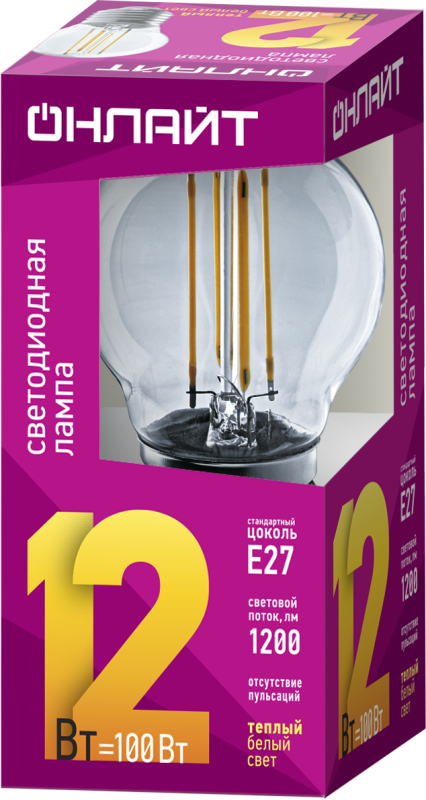Лампа светодиодная филаментная 80 884 OLL-F-G45-12-230-2.7K-E27 12Вт шар прозрачная 2700К тепл. бел. E27 1200лм 220-240В ОНЛАЙТ 80884