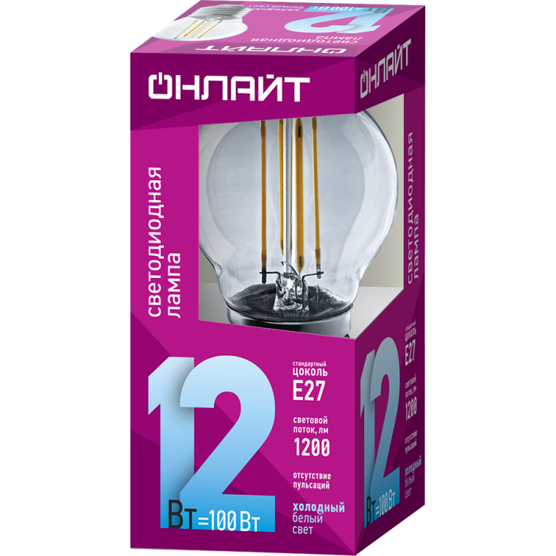 Лампа светодиодная филаментная 80 885 OLL-F-G45-12-230-4K-E27 12Вт шар прозрачная 4000К нейтр. бел. E27 1200лм 220-240В ОНЛАЙТ 80885