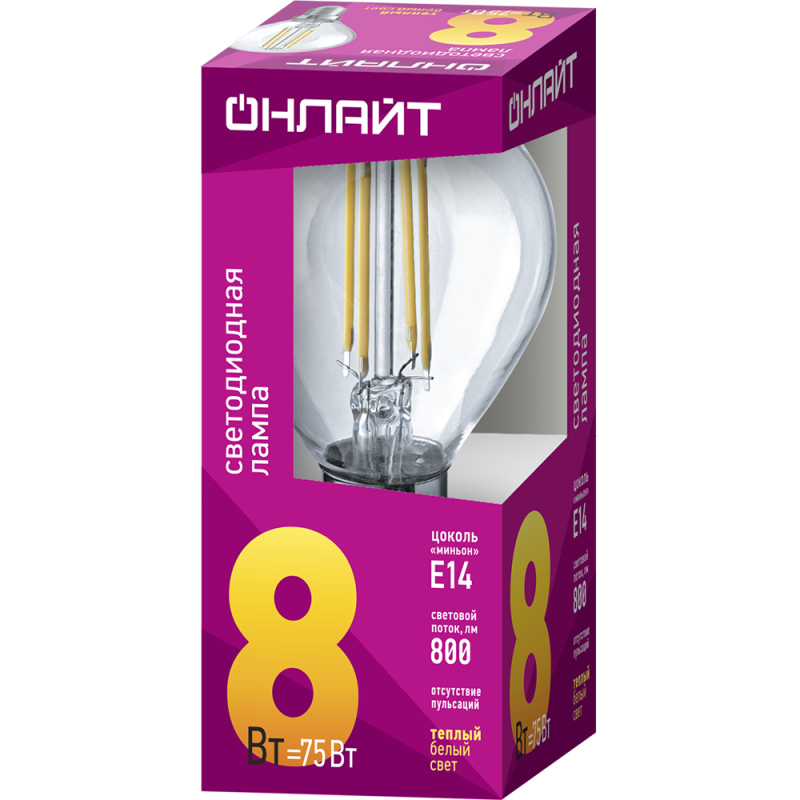 Лампа светодиодная филаментная 80 886 OLL-F-G45-08-230-2.7K-E14 8Вт шар прозрачная 2700К тепл. бел. E14 800лм 220-240В ОНЛАЙТ 80886