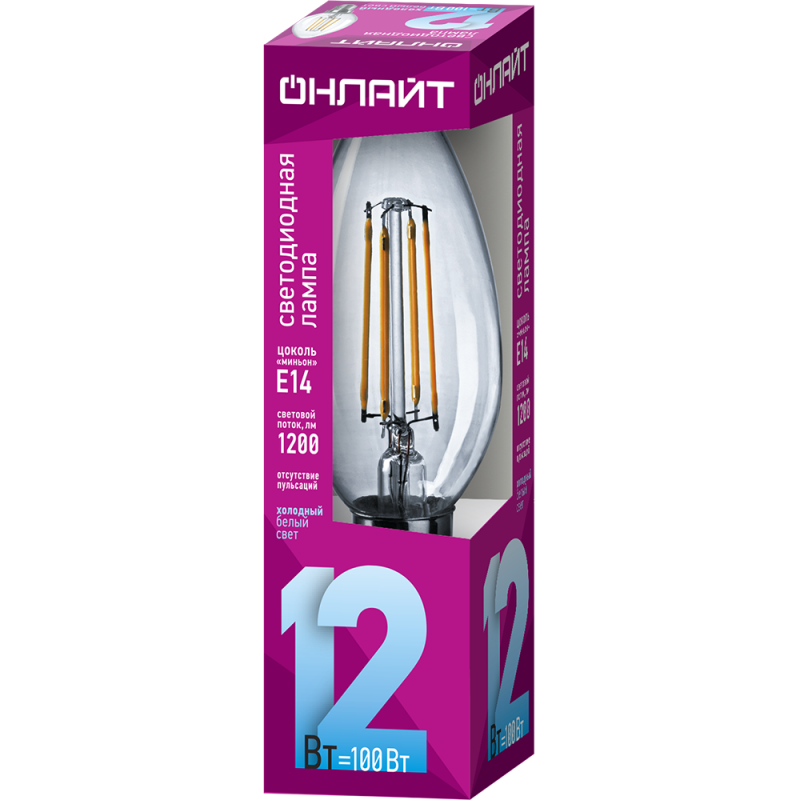 Лампа светодиодная филаментная 80 897 OLL-F-C35-12-230-4K-E14 12Вт свеча прозрачная 4000К нейтр. бел. E14 1200лм 220-240В ОНЛАЙТ 80897