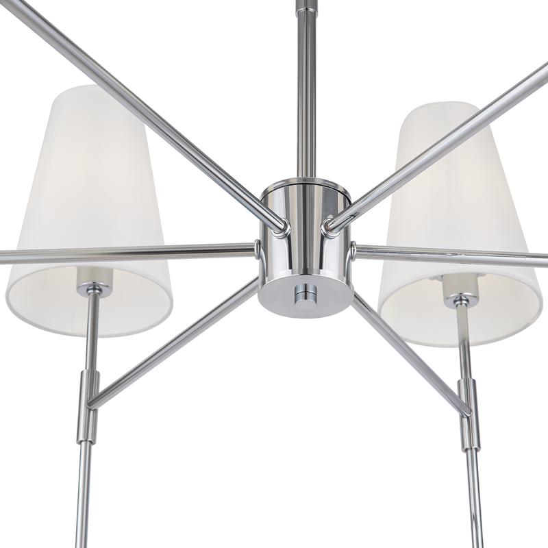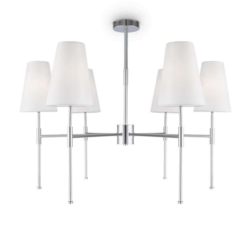 Материал арматуры – металл. Оттенки: хром, комбинация черного и латуни. Абажуры – белая ткань. Акцентный вытянутый силуэт. Источник света – лампа с цоколем E14.