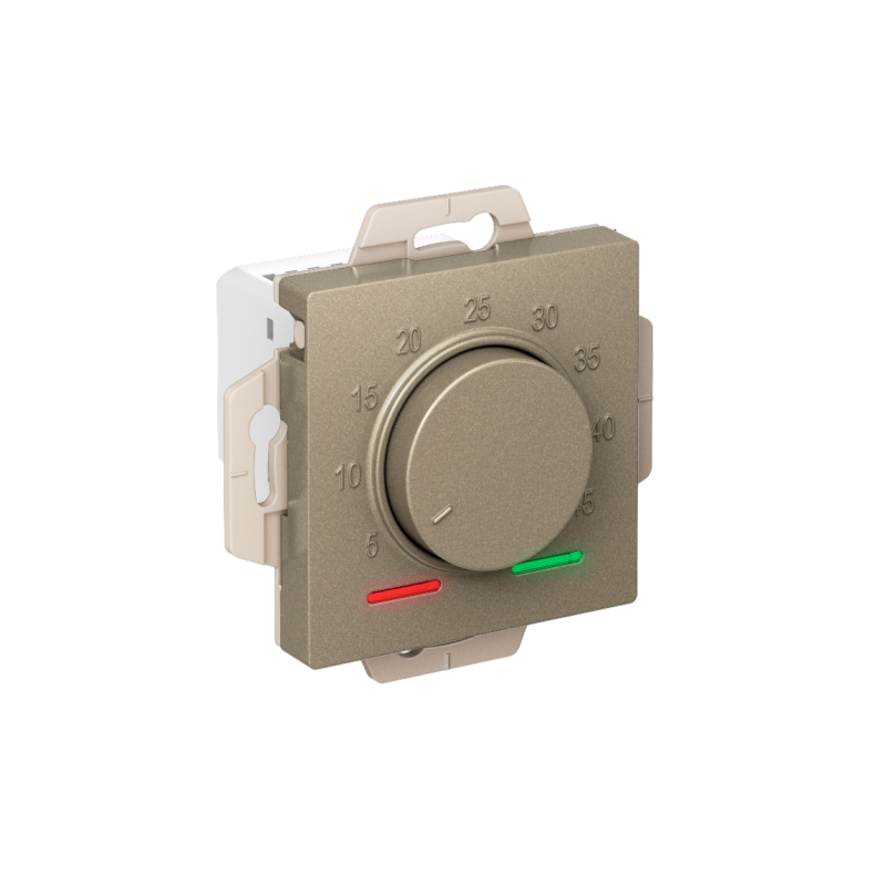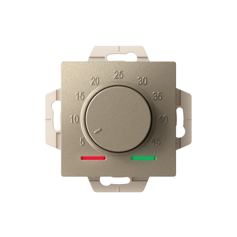Термостат Systeme Electric (ранее Schneider Electric) серии AtlasDesign электронный для теплого пола, с датчиком, 10 A в цвете шампань обеспечит комфортное регулирование температуры пола и идеально впишется в интерьер помещений. Ном. напряжение: 230 В. Частота: 50 Гц. Электронная защита от перенапряжения. Диапазон регулирования: от +5 до +45 °С. Датчик температуры пола в комплекте (кабель 2,5 м), тип NTC. Степень защиты от пыли и влаги: IP20.