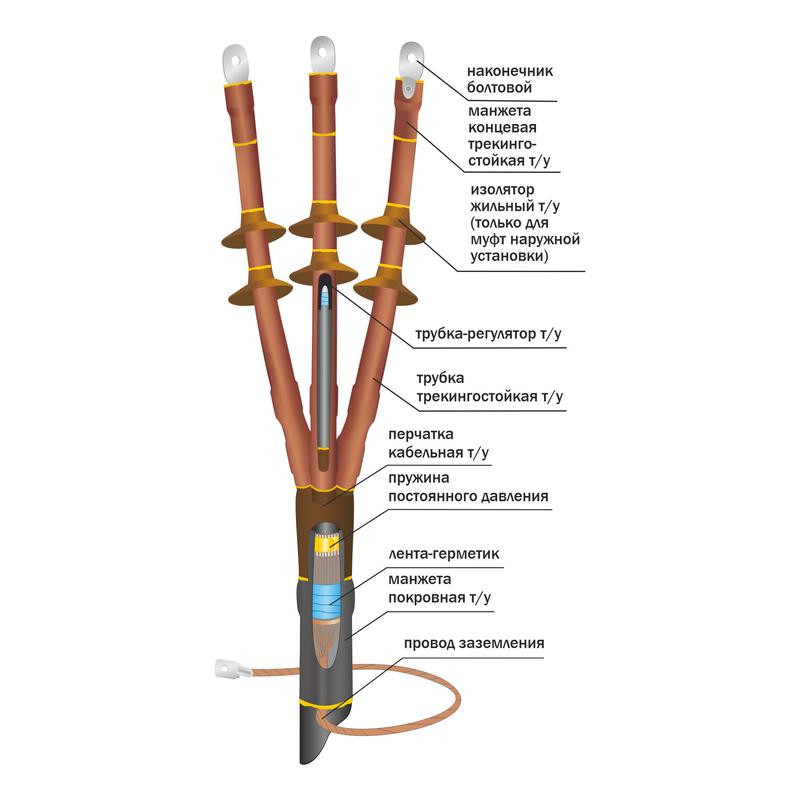 Монтируется на разделке кабеля путем термоусаживания деталей из модифицированного полимера с помощью газовой горелки или высокотемпературного фена. Универсальные болтовые наконечники со срывными головками, входящие в комплект кабельной муфты, подходят для кабелей как с алюминиевыми, так и с медными жилами. Провод заземления формируется из медного проволочного экрана кабеля, а для кабелей с ленточным экраном предусмотрен специальный комплект заземления.