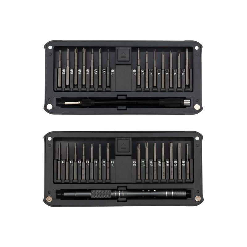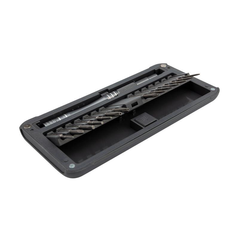 В наборе отвертка с 28 битами: 1.5, 2.0, 3.0, PH0, PH1, PH2, PH00, PH000, T1, T2, T3, T4, T5, TR6, TR8, TR10, TR15, H1.5, H2.0, H3.0, P2, P5, P6, U2.6, Y0.7, Y3, Triangle 2.3, Special PH2.5.