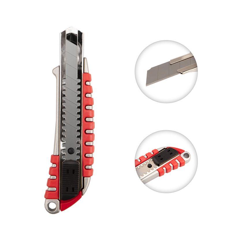 Лезвие шириной 18 мм, изготовленное из стали У8А, фиксируется автоматически. Когда крайний сегмент затупляется, его можно отломить и продолжить использовать инструмент.