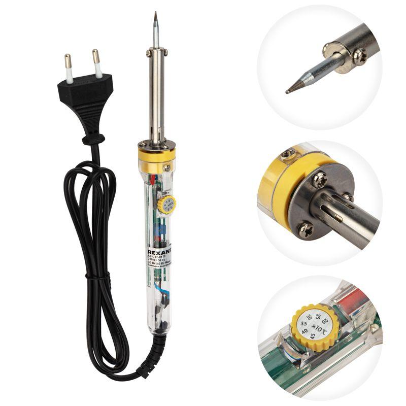 Паяльник с регулировкой температуры мощностью 30-50Вт REXANT предназначен для ручного монтажа/демонтажа электронных компонентов и других мелких и средних деталей. Подходит как для любительского, так и для профессионального использования. Функционал прибора позволяет с помощью регулятора менять рабочую температуру жала в диапазоне 200...450°C. Долговечное жало паяльника состоит из медьсодержащего сердечника, покрытого слоем электролитически осажденного железа, отличающегося высокой стойкостью к коррозии. При соблюдении ряда предосторожностей жало способно работать длительное время без утраты эксплуатационных свойств, а в случае необходимости его можно легко и быстро заменить (сменное жало в комплект не входит).
