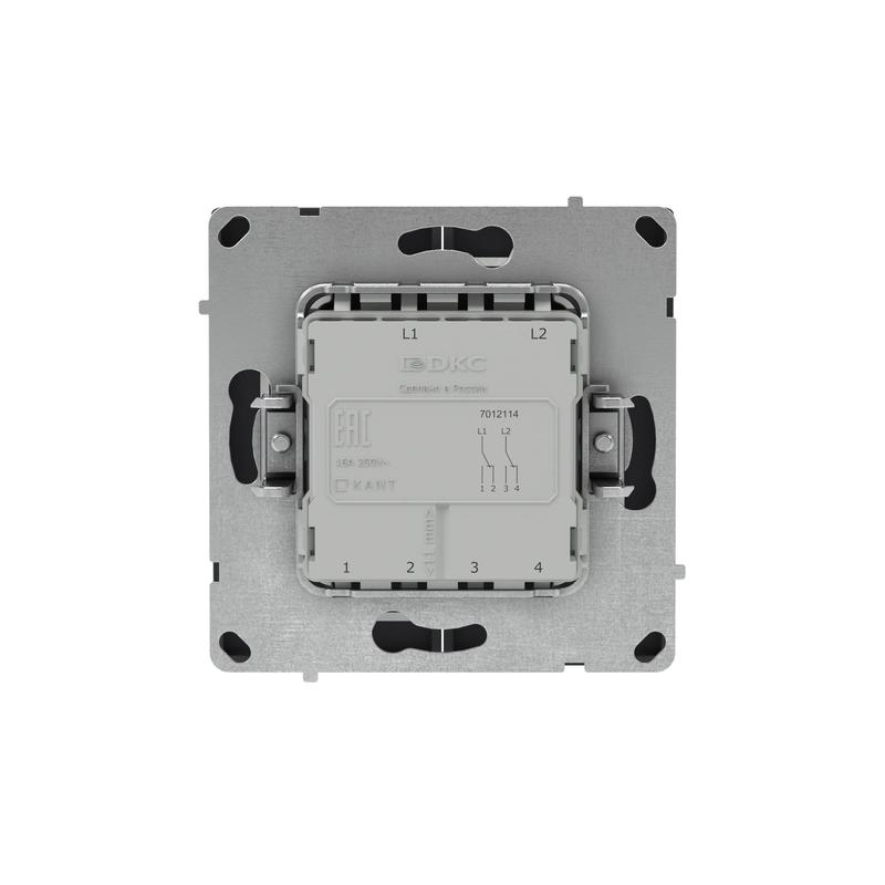 Двухклавишный переключатель применяется для управления двумя контурами освещения из 2 мест. Предназначен для скрытого монтажа в стену. Характеристики устройства: номинальное напряжение 250 В, номинальный ток 16 А. Материал: металл, поликарбонат. Пластиковые элементы имеют цвет "Черный уголь". Для декоративного оформления электроустановочных изделий используются рамки серии "KANT".
