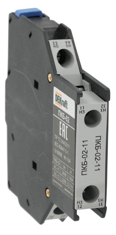 Приставка контактная серии ПКБ-02-11 для контакторов КМ-102 Dekraft; кол-во контактов - 1НО и 1НЗ; ном.ток 10 А; ном.напряжение до 690 В; установка с боковой стороны; степень защиты IP20. Приставки контактные предназначены для увеличения количества вспомогательных контактов контактора. Приставки боковой установки ПКБ-02-11 позволяют значительно сэкономить на глубине шкафа, который будет стоить дешевле.