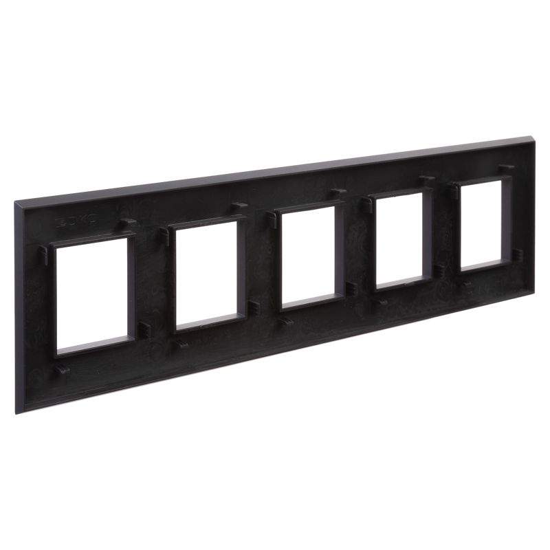 Рамки ДКС, разработанные студией Артемия Лебедева, предназначены для декоративного оформления электроустановочных изделий. Цвет рамки: "Черный матовый" - темный, манящий, приглушающий свет акцент. Отсутствие следов от прикосновений на поверхности изделий дает ощущение премиального вида в интерьере. Линейка сочетается с текстурными сдержанными покрытиями, интерьерами в различных стилях от минимализма и контемпорари до арт-деко и гранж, на стенах из необработанного кирпича в помещениях лофт. В рамке предусмотрено 5 постов под ЭУИ (10 модулей). Рамка может быть размещена как горизонтально, так и вертикально. Габаритные размеры: 375х90 мм. Материал – термопласт.