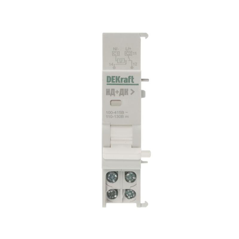 Расцепитель независимый серии НД-105 Dekraft для серий ВА-105, ВА-105 DC; предназначен для дистанционного отключения выключателя; ном.напряжение 110-415В пер. тока и 110-130В пост. тока; напряжение срабатывания 70-110% Un; ширина 18 мм; присоединение к аппарату слева.