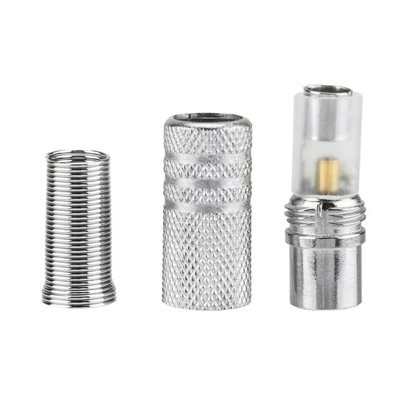 Никелированный TV-разъем штекер REXANT с пружиной предназначен для подключения эфирного, спутникового и кабельного телевидения с помощью радиочастотного кабеля.