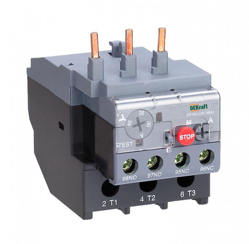 Тепловое реле перегрузки серии РТ-02 Dekraft; предназначено для применения с контакторами КМ-102 на ток 25-38 А; трехполюсное; диапазон уставок реле 23,0-32,0 А; класс расцепления 10А; два режима повторного включения - ручной и автоматический. Тепловые реле РТ-02 применяются для защиты цепей переменного тока и электродвигателей от перегрузки, асимметрии фаз, затянутого пуска и заклинивания ротора. Реле подходит к соответствующим контакторам других производителей.