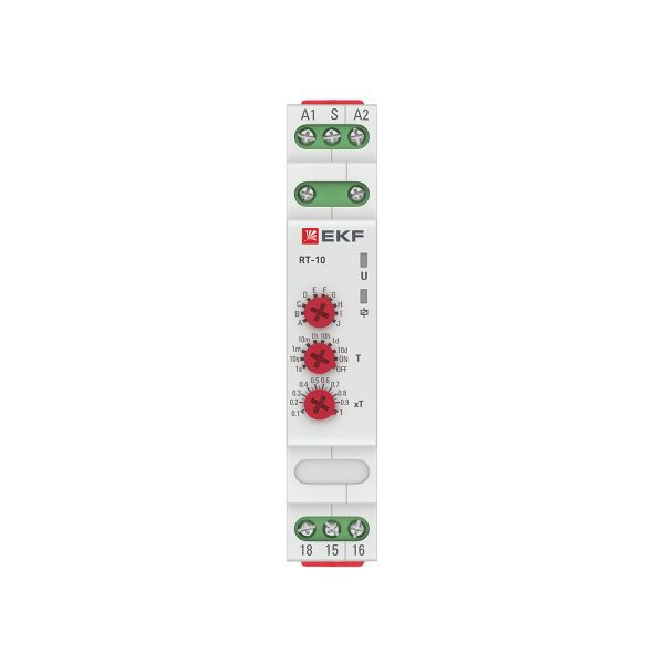Многофункциональное реле времени RT-10 EKF является электронным коммутационным аппаратом с регулируемыми режимами работы и регулируемой установкой времени. Реле предназначено для включения или отключения нагрузки по заданным временным величинам и режимам работы. Переключение диапазонов времени и исполняемой функции производится с помощью поворотных регуляторов расположенных на лицевой поверхности реле. Реле может работать по одной из 10 возможных функций