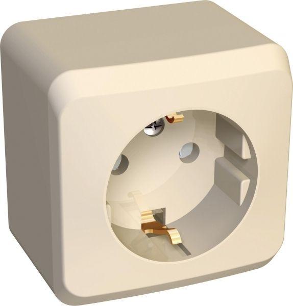 Розетка Systeme Electric (ранее Schneider Electric) ЭТЮД (кремовый, открытой установки) одноместная с заземлением и шторками предназначена для применения в сетях до 250В, на ток до 16А. Шторки открываются при одновременном давлении в оба отверстия и препятствуют проникновению посторонних предметов. Они обеспечивают дополнительную безопасность в доме, где находятся дети. Сделано в России.