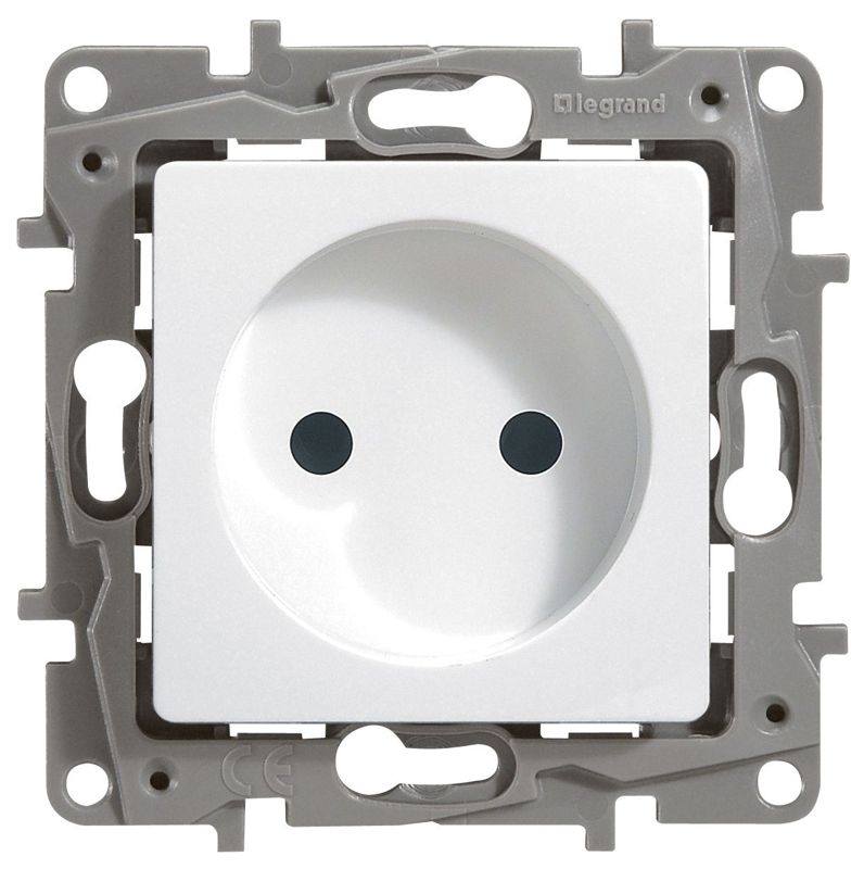Розетка без заземления ETIKA для скрытого монтажа. Максимальный ток 16 А, максимальная мощность 3680 Вт. Применяется в зданиях с проводкой без заземления (без защитного проводника).