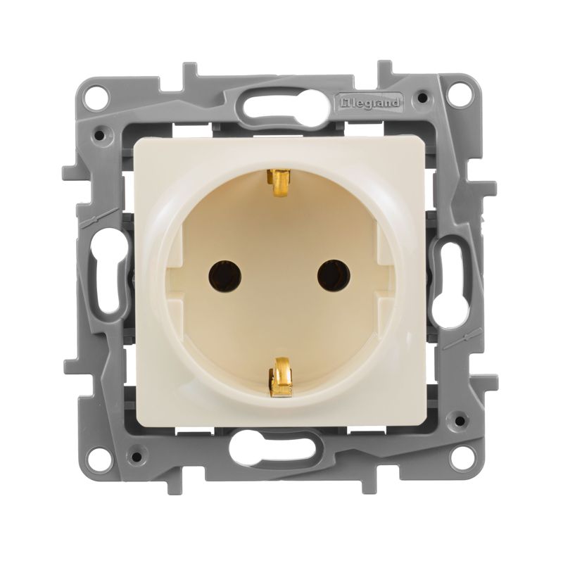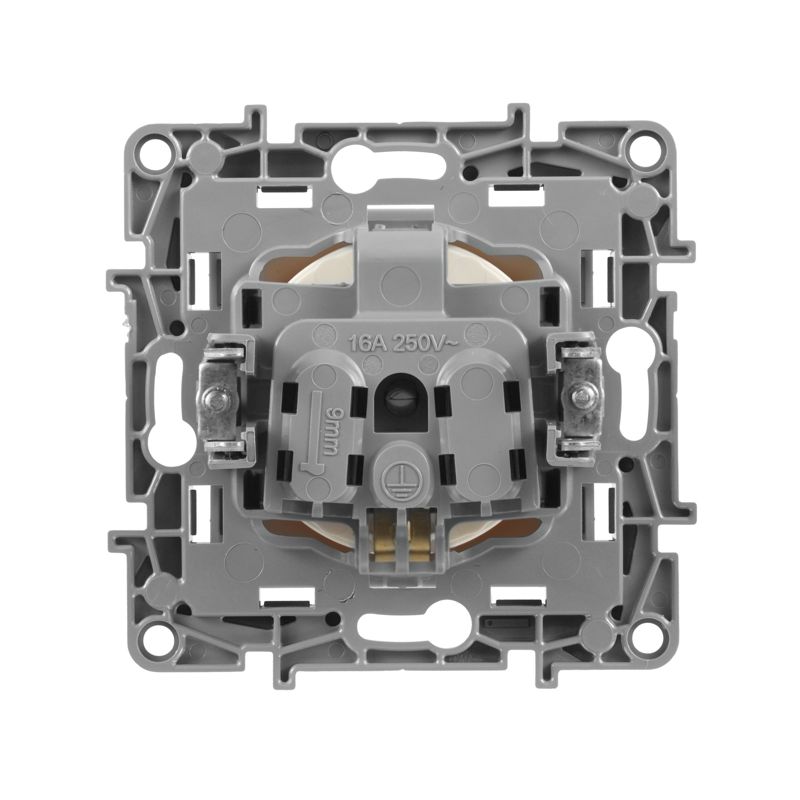 Розетка с заземлением ETIKA для скрытого монтажа. Максимальный ток 16 А, максимальная мощность 3680 Вт. Применяется в зданиях, оборудованных для повышения безопасности проводкой с заземлением (с защитным проводником).