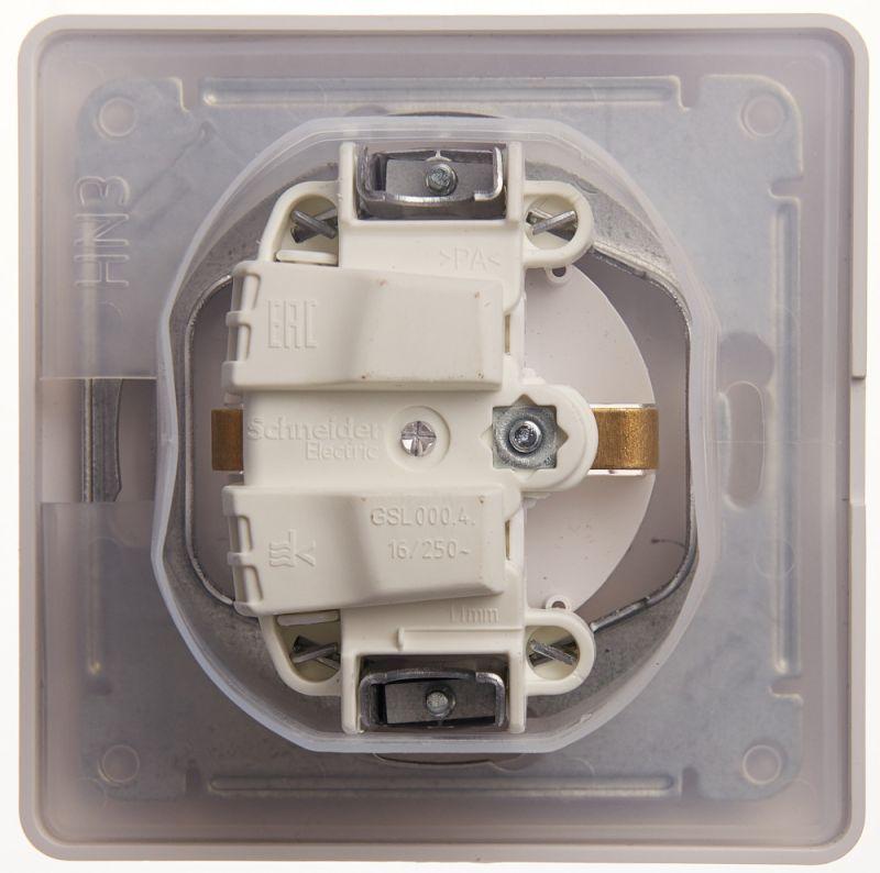 Розетка Systeme Electric (ранее Schneider Electric) серии Glossa (в сборе, цвет белый) одинарная с заземлением, шторками и крышкой подходит для сетей 250 В, на ток 16 А. Изделие со степенью защиты IP44 обеспечит безопасность использования в ванной и на кухне. Заземляющий контакт обеспечивает дополнительную защиту от удара электрическим током. При наличии заземления электрический потенциал уходит в землю, защищая человека. Выполнен из материала PС+ASA, стойкого к УФ-излучению и появлению царапин.