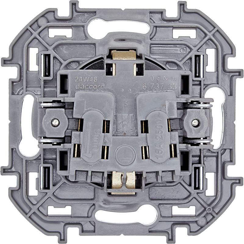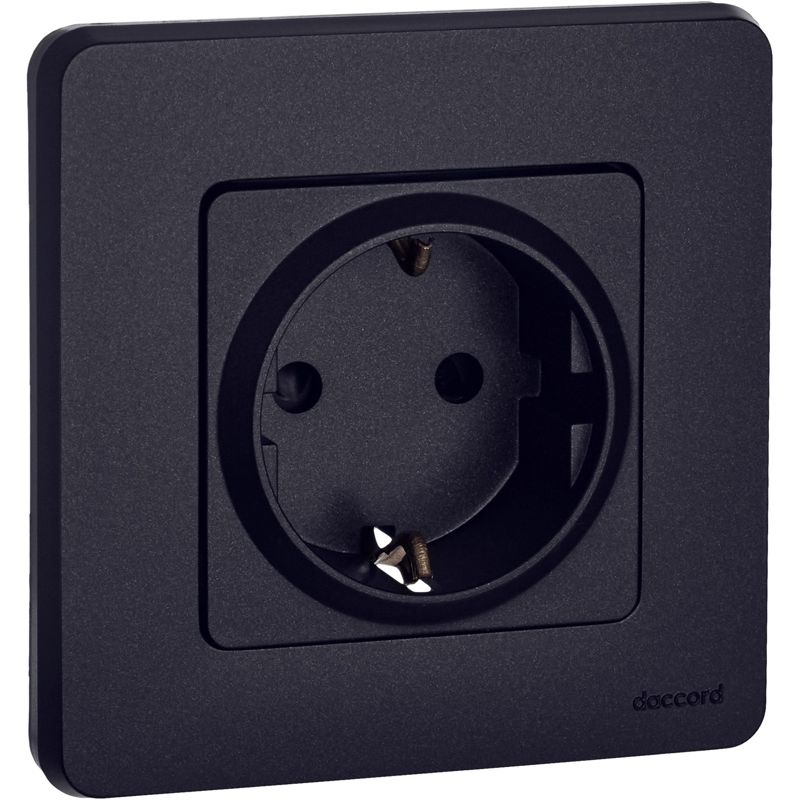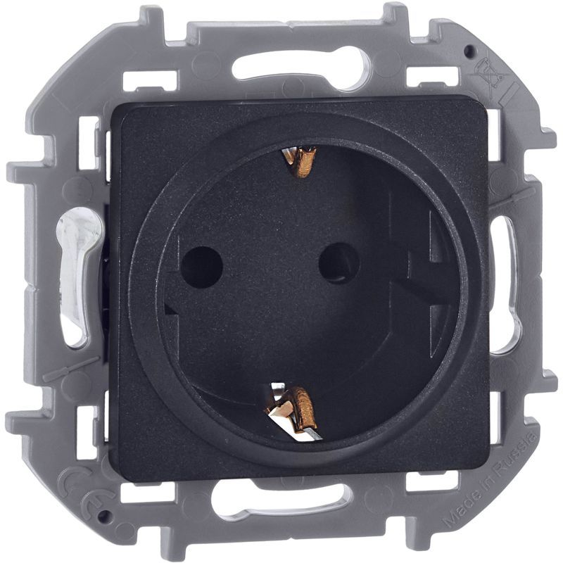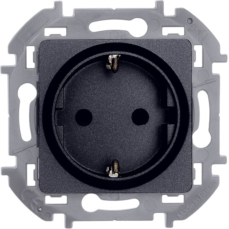 Розетка с заземлением, с защитными шторками для скрытого монтажа Inspiria, цвет "Антрацит", максимальный ток 16А, напряжение ~250В, максимальная мощность 3680Вт, винтовые зажимы. Применяется для присоединения однофазных электрических потребителей к сети переменного тока в зданиях с проводкой с заземлением (с защитным проводником).